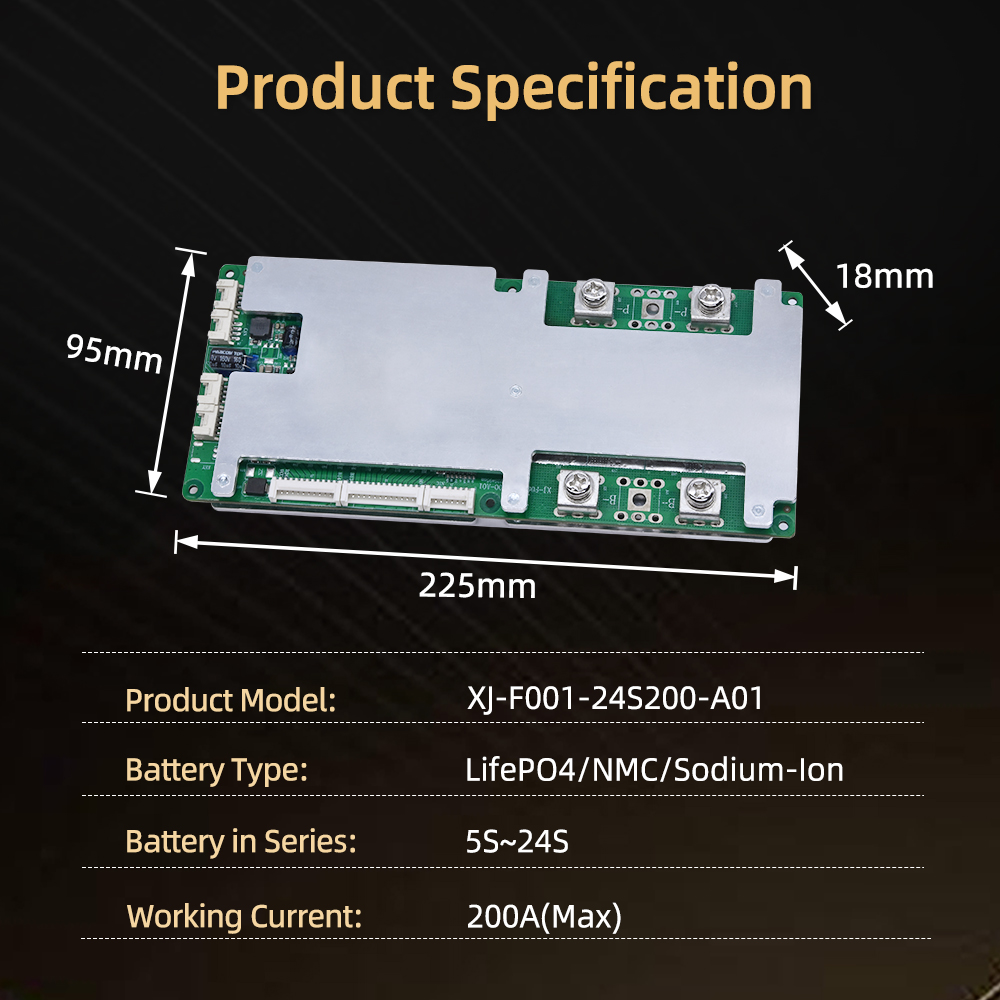 XJ-F001-24S200-A01 is a high-power 5-24S lithium battery management system supporting bidirectional 200A charging/discharging with Bluetooth connectivity. Features real-time monitoring, comprehensive protections, and customizable parameters.